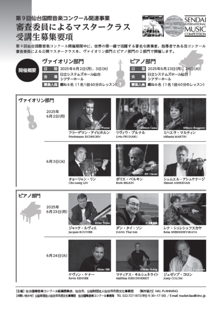 第9回仙台国際音楽コンクール期間中に、若い音楽家の育成を目的とし、世界の第一線で活躍する著名な演奏家、指導者である当コンクール審査委員による公開マスタークラスを、ヴァイオリン、ピアノの2部門で開催します。