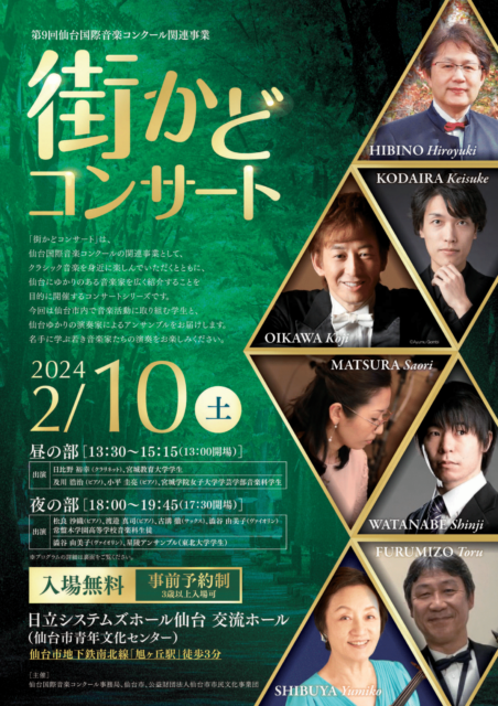 「街かどコンサート」は、仙台国際音楽コンクールの関連事業として、クラシック音楽を身近に楽しんでいただくとともに、仙台にゆかりのある音楽家を広く紹介することを目的に開催するコンサートシリーズです。今回は仙台市内で音楽活動に取り組む学生と、仙台ゆかりの演奏家によるアンサンブルをお届けします。名手に学ぶ若き音楽家たちの演奏をお楽しみください。