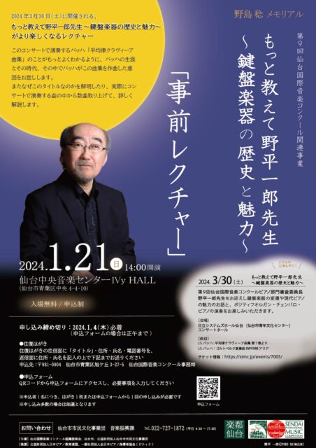 第9回仙台国際音楽コンクールピアノ部門審査委員長 野平一郎先生をお迎えし鍵盤楽器の変遷や現代ピアノの魅力のお話と、ポジティフオルガン・チェンバロ・ピアノの演奏をお楽しみいただきます。